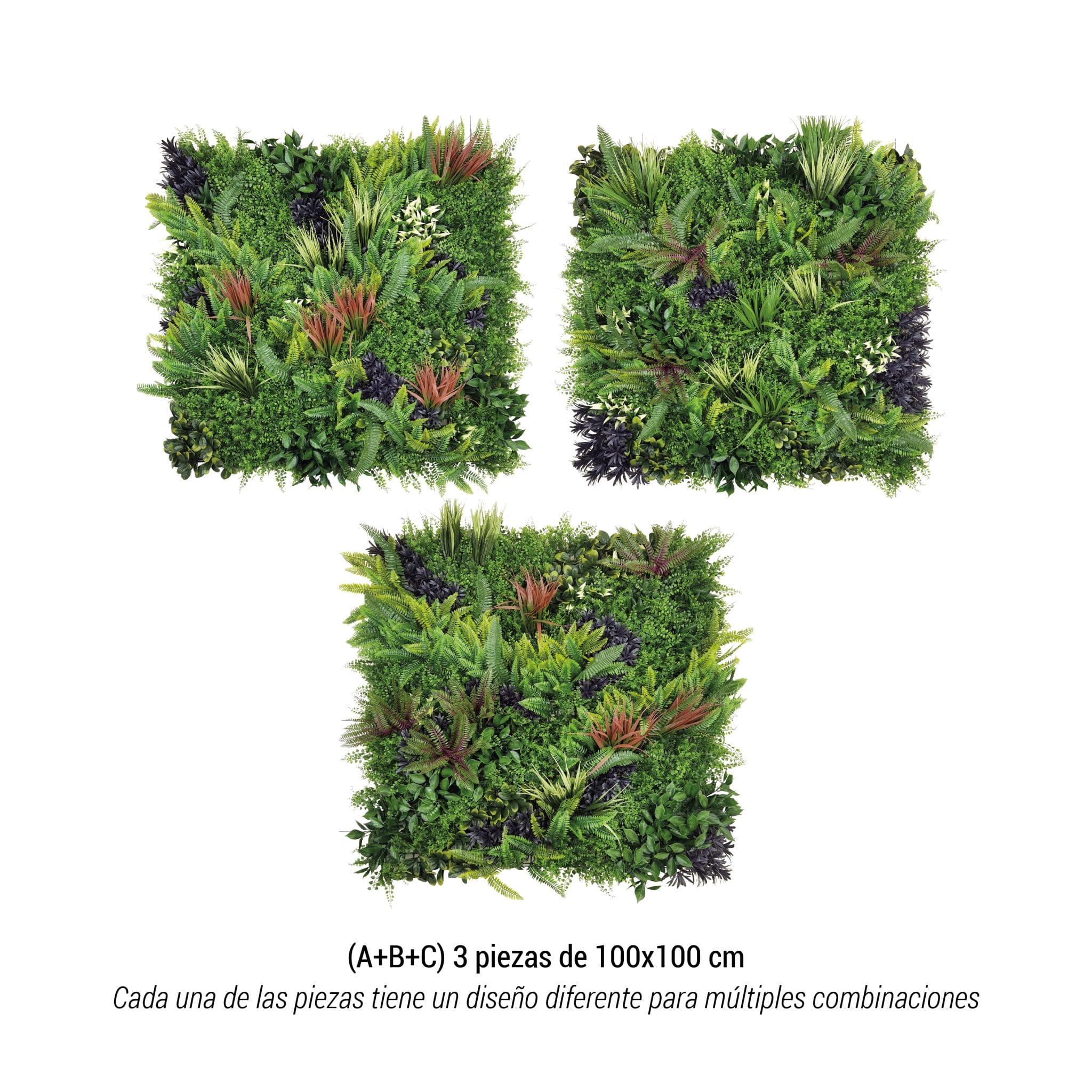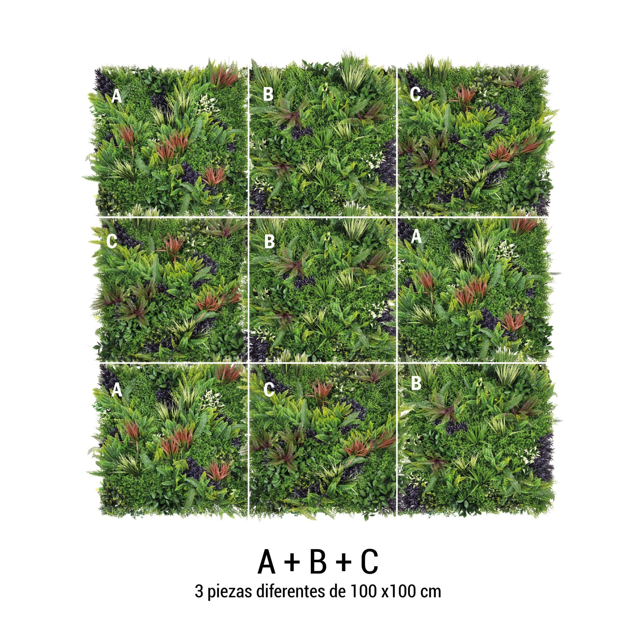 El jardín vertical artificial  Amazonas está inspirado en su exuberante vegetación, este modelo te sumerge en un mundo de colores y texturas asombrosas. Está formado por tres piezas (A+B+C) de 100 x 100 cm cada una (3m² totales), todas ellas con un diseño diferente, para que puedas combinarlas entre sí, o colocarlas por separado.